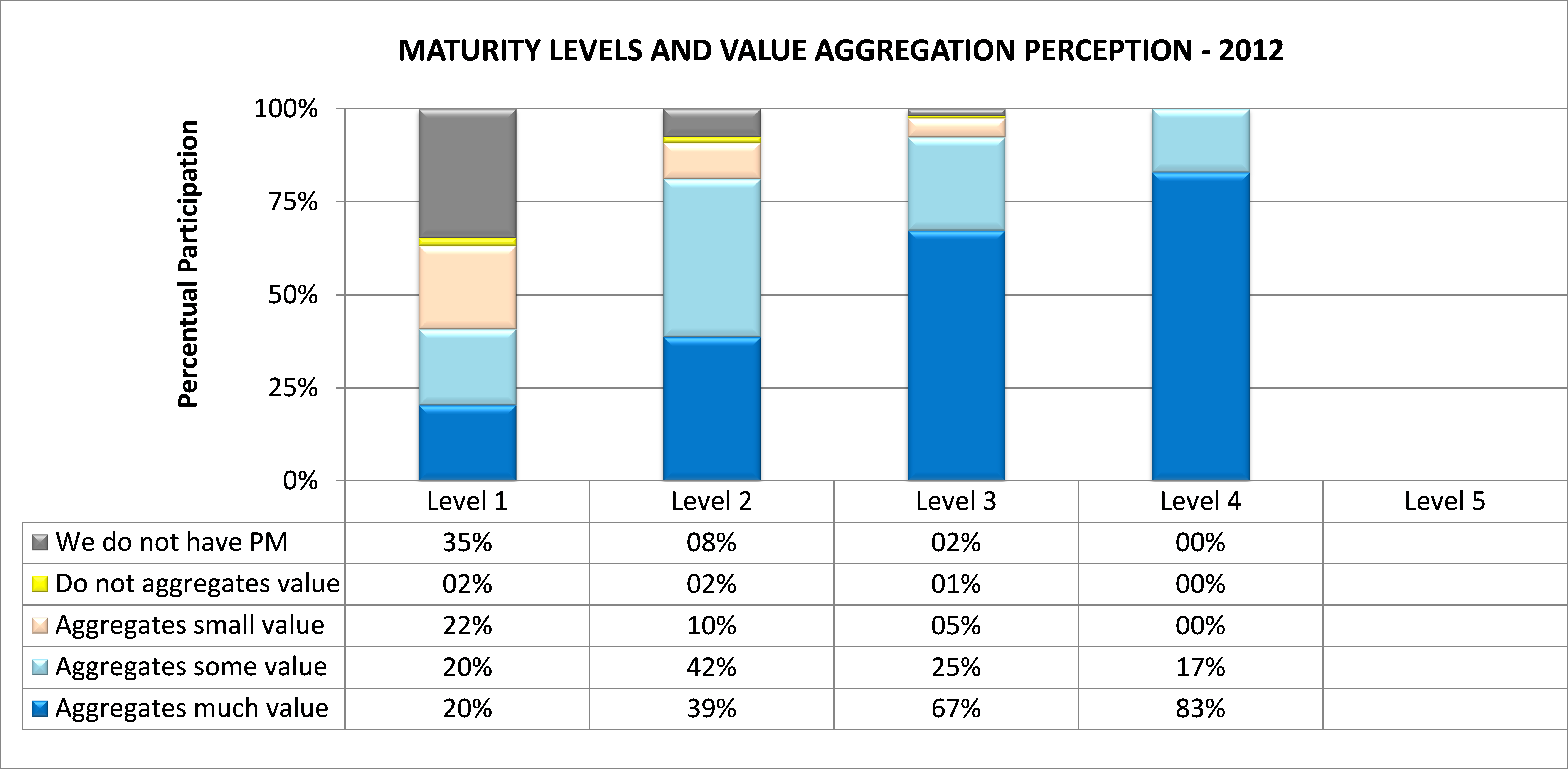 From Figure 4 we can conclude that there is a direct positive relationship between Perceived Value Aggregation and Project Management Maturity Levels. The higher the maturity, the greater the perception of added value by key stakeholders!