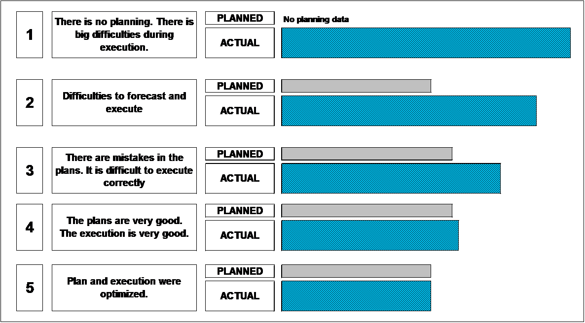 A greater maturity in PPPM provides shortest time, and greater adherence to the expected costs and delivery of the results (outcomes) that are expected. Figure 2 shows a generic example of the benefits obtained by maturity level evolution regarding the management (planning and execution) of the time aspect. This figure just gives an idea about the evolution of a department of an organization that always executes projects. The values in the figure represent fictitious averages of planning and real execution times, on a hypothetical portfolio of projects. Similar arrangements could be built for cost, scope and quality. Increasing this understanding, the organization that has evolved into optimized project management capability would be better able to perform each year a greater number of projects with greater project success.